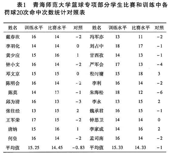 自信心是发挥运动能力的条件之一。信心不足会使队员感到拘束、犹豫不决,从而导致罚球不中。自信心也是运动员保持沉着冷静和集中注意力的来源。自信心是运动员本身毅力的表现。这种自信心来源于队员良好的竞技状态与自我感觉,来源于自我控制心身的毅力。教练员应肯定和赞赏队员的竞技状态、自控能力与毅力,从而增强队员的自信心。队员在罚球时,整个心理活动是复杂的,每一个球能否命中都影响自己队的成绩的高低,因而心理压力较大,出现心理紧张、肌肉僵直、动作变形的现象,不能发挥原有的技术水平(见表1)。