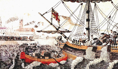1773年11月,当装载342箱茶叶的东印度公司船只开进波士顿港,引起了茶党的注意。12月16日,波士顿八千群众集会,要求停泊在那里的东印度公司茶船开出港口,但遭拒绝。当晚,在茶党组织下,化装成印第安人的青年闯入船舱,将东印度公司三只条船上的342箱茶叶(价值18,000英镑)全部倒入大海。