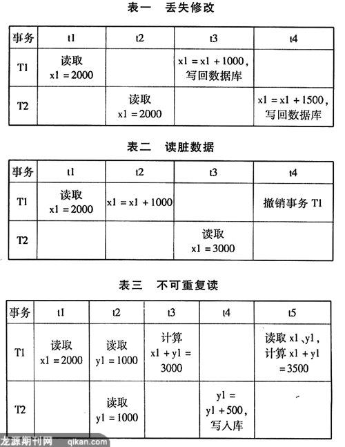 并发是多个事务同时存取数据库同一数据时可能会导致数据存取不一致,数据不真实的现象。并发将引起数据争用,可导致丢失更新、读脏数据、不可重复读三类错误,破坏数据的一致性。(如表一所示)