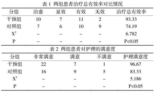 两组患者在进行干预后,在治疗总有效率角度上,干预组(93.33%)治疗总有效率高于对照组(74.19%),双方具有着统计学意义;在护理满意度的角度上,干预组的护理满意度要高于对照组,P<0.05表示具有统计学意义。