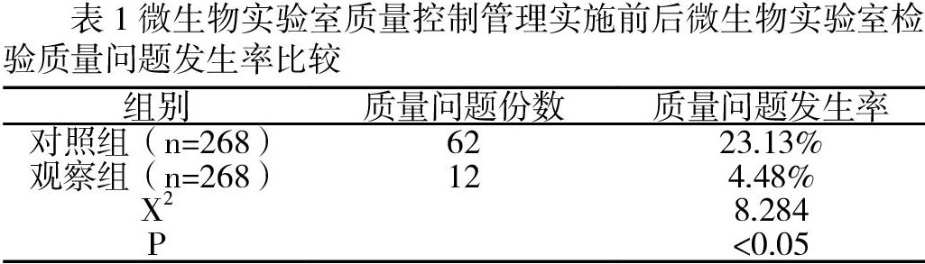 采取回顾分析法选择2019年1月-2019年12月期间未实施微生物实验室质量控制管理前我中心检查的微生物样本268份,为对照组;并选择2020年1月-2020年12月期间实施了微生物实验室质量控制管理后我中心检查的微生物样本268份,为观察组。两组微生物检验样本资料如下:对照组268份样本中,包括肛拭子144份(主要查沙门氏菌和志贺氏菌)、医院消毒效果监测样本124份(包括卫生手50份、物体表面49份、空气培养15份、消毒液10份,均查菌落总数)。观察组268份样本中,包括肛拭子134份(主要查沙门氏菌和志贺氏菌)、医院消毒效果监测样本134份(包括卫生手52份、物体表面57份、空气培养15份、消毒液10份,均查菌落总数)。